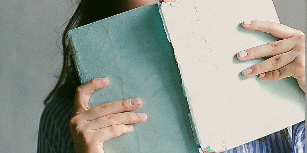 stack of books on a table with a person behind the stack, showing only their arms and shoulders